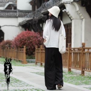 Cotton and linen women’s new double-layer bamboo texture sense round neck loose design women’s bat shirt T-shirt